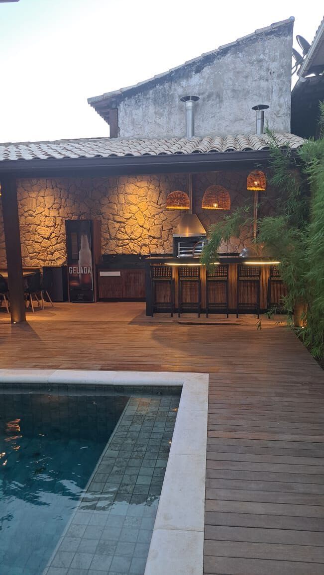 São 5 suítes, banheira na suite Master, jacuzzi e piscina aquecida, sauna molhada, sala de jogos, sala de TV, área gourmet completa com fogão, forno a lenha, churrasqueira, geladeira e frigobar, garagem para 3 carros.